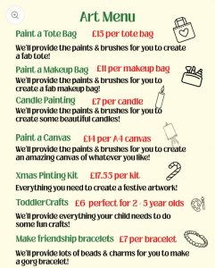 Toddlers who are under 5 will be a flat fee of £6 & can enjoy our festive craft supplies!