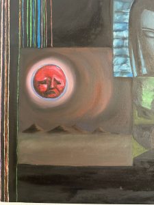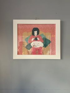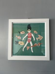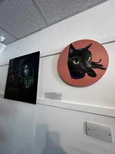 Further down the gallery, Katy Lancaster’s work dazzled with its vivid mix of dreamy landscapes, anime-infused colour, and digital-age symbolism. Using acrylics and watercolours, she creates scenes that blur the natural with the virtual “a healthy dose of doomscrolling for inspiration,” as she playfully puts it. Each piece was a world unto itself, swirling with energy and emotion.