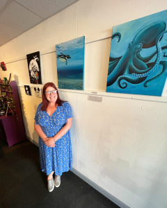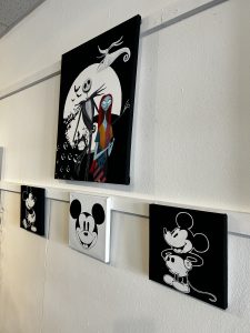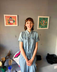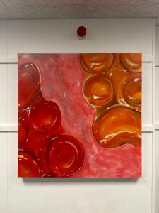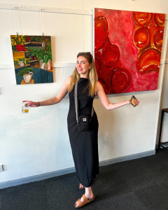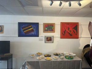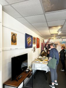 On another wall, Olivia McIntosh’s bold paintings in pinks and blues caught the light just right. Olivia, who recently completed her Master’s in Fine Art, brings her passion for accessibility to life not only through her artwork but also in the workshops she leads at Make on the Corner. Her presence at the showcase was as vibrant as her work-uplifting, confident, and community-minded.