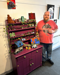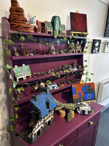One section was transformed by Tom Wilson, a local miniaturist whose intricate figurines and elaborate dioramas were arranged atop a striking deep purple dresser upcycled by Tom himself. The earthy tones of his work were highlighted by whimsical touches, such as leafy green putty that wove through his sculptures and small botanical paintings. His display felt magical yet grounded, echoing his deep-rooted passion that’s been with him since he began crafting miniatures at age 15.