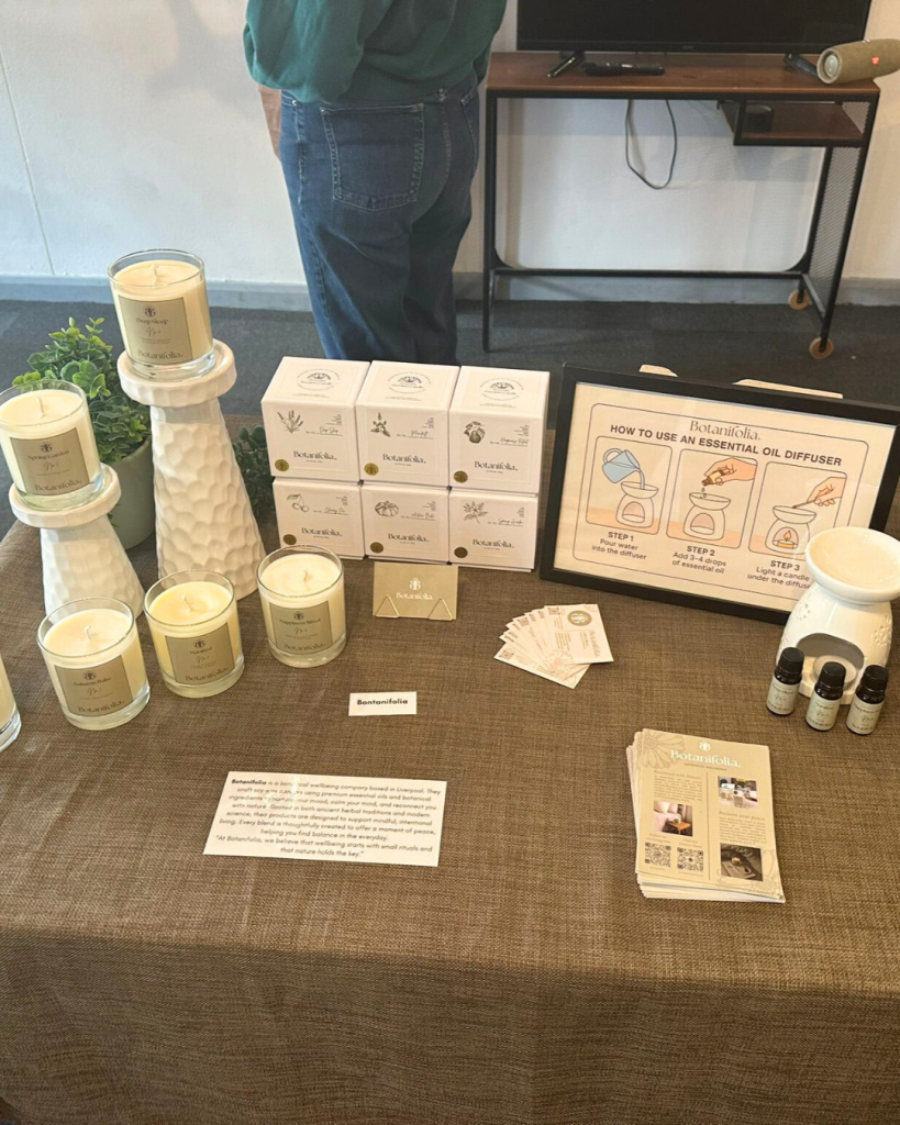 In the centre of the room, a screen played Capital H Productions’ new short film Excavation (2025) on a gentle loop. Created by Shaun and Ben, the film follows a struggling musician retreating into the woods for inspiration, inspired by the music of Bon Iver. With its meditative pace and stunning cinematography, it invited visitors to pause and reflect. Adding another soothing sensory layer to the experience was Botanifolia, a Liverpool-based botanical wellbeing brand. Their hand-poured soy candles, infused with essential oils and herbal blends, offered calming aromas that drifted throughout the space.