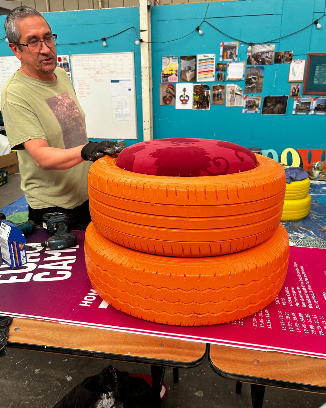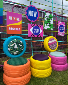 Our seating area, for example, was made using discarded tyres from a Liverpool-based tyre company, which were destined for waste. These were cleaned, painted in bright colours by Rachel Owen and Ian Curry, and upholstered using textile waste from Roberts Recycling, giving them a completely new lease of life.