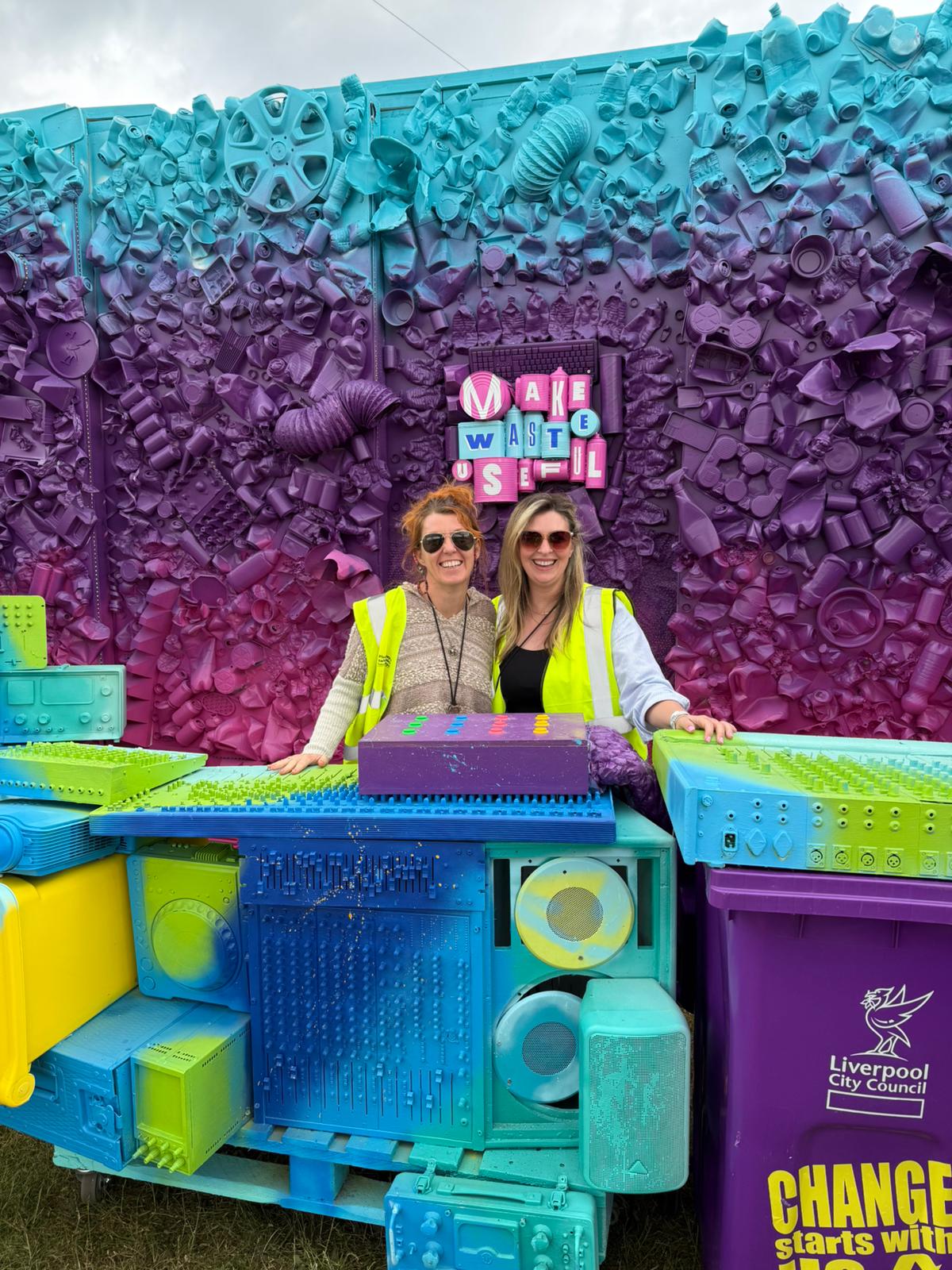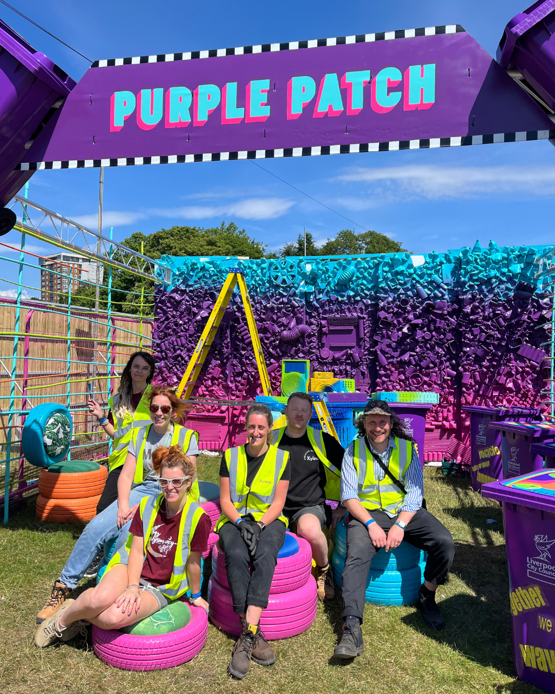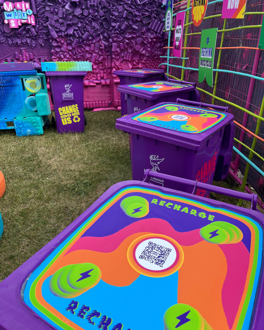 Purple Patch was designed to be more than just a resting spot – it was an experience that blended creativity, education, and community. Visitors could relax on our colourful tyre seating, wirelessly charge their phones at custom charging stations built into iconic purple bins, and engage with our dramatic “waste wall” – a bold installation made from 2,000 real household waste items sourced by Liverpool StreetScene Services. Mounted on reused festival wall panels and sprayed in a purple ombré by Rachel Smith Evans from Quirky Design Co, the wall sparked vital conversations about the volume of everyday waste we generate and how we can do better.
