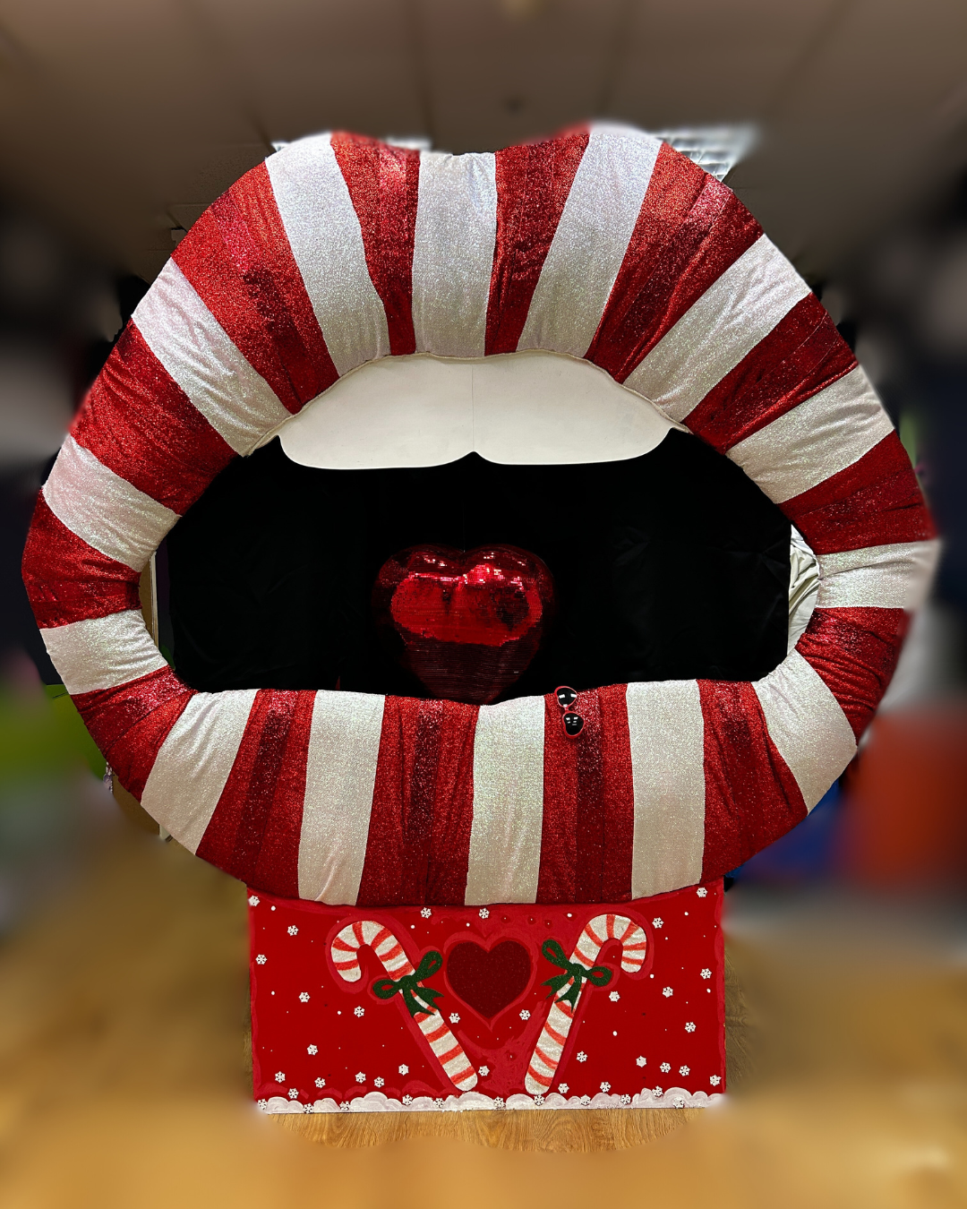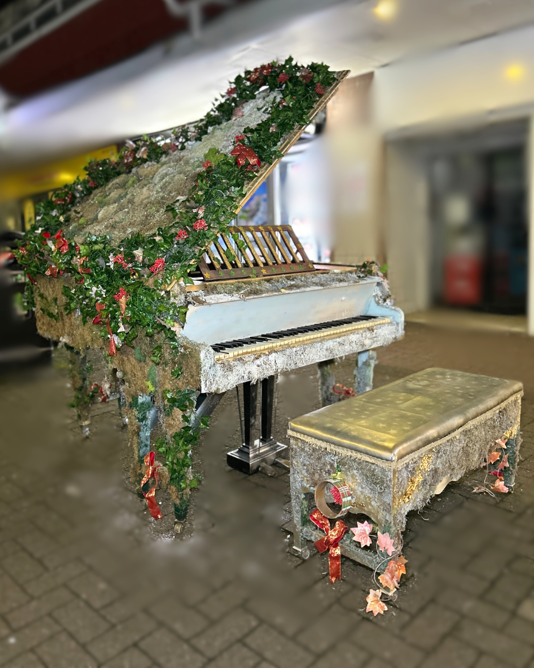 At Cherry Tree Shopping Centre in Liscard, a moss-covered baby grand piano became a whimsical seasonal centrepiece, joined by candy cane lips that sparked curiosity and photo ops. These works later journeyed to Birkenhead Market, part of their festive decorations.